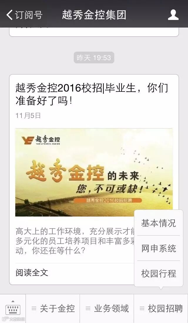你还可以通过网申系统申请岗位。“越秀金控集团”公众号还为各位同学专设校园招聘通道,让大家快速进入网申系统、查询宣讲会行程、路线导航等信息。