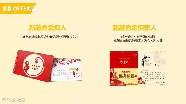 、职业发展、培养机制....还有面试期间设置的茶歇区、休整区......拿到Offer后,还有由公司向被录取的同学及他们的家人寄出的纪念卡!越秀金控的暖男形象引起台下同学们一次又一次的鼓掌!主页君在现场都听得沸腾了!剧透一张PPT,真是暖到家了有没有!
