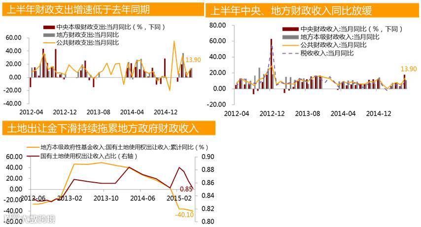 经济下行使得财政收入增速放缓,上半年中央和地方财政收入增速均低于去年同期水平;受收入增速放缓的拖累,中央和地方财政支出增速也低于去年同期水平,财政支出仍需加力增效以实现稳增长目标。