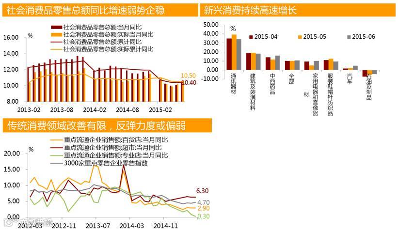 导读:2015年上半年经济数据点评第二部分来咯!实际消费支出增速降中趋稳上半年实际消费增长10.5%,比去年同期放