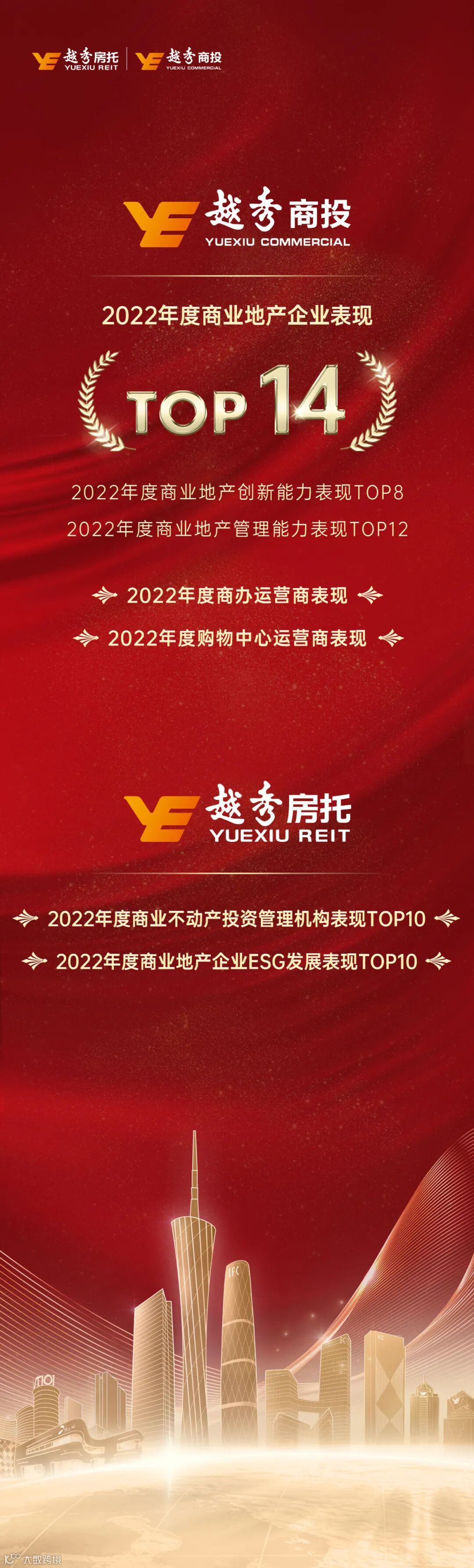 同时,越秀房托亦斩获2022年度商业不动产投资管理机构表现奖TOP10、2022年度商业地产企业ESG发展表现大奖TOP10;越秀商投旗下公司越秀怡城荣获2022年度商写物业服务企业表现奖。商业标杆项目广州国际金融中心、越秀金融大厦,共同斩获2022年度商办资产运营表现奖。系列荣誉展示了越秀商投出色的资产管理和资本运作实力,展示公司强大的护城河能力,亦充分表明业界对越秀商投的认可,印证“商业地产全链资管亚洲领航者”地位。