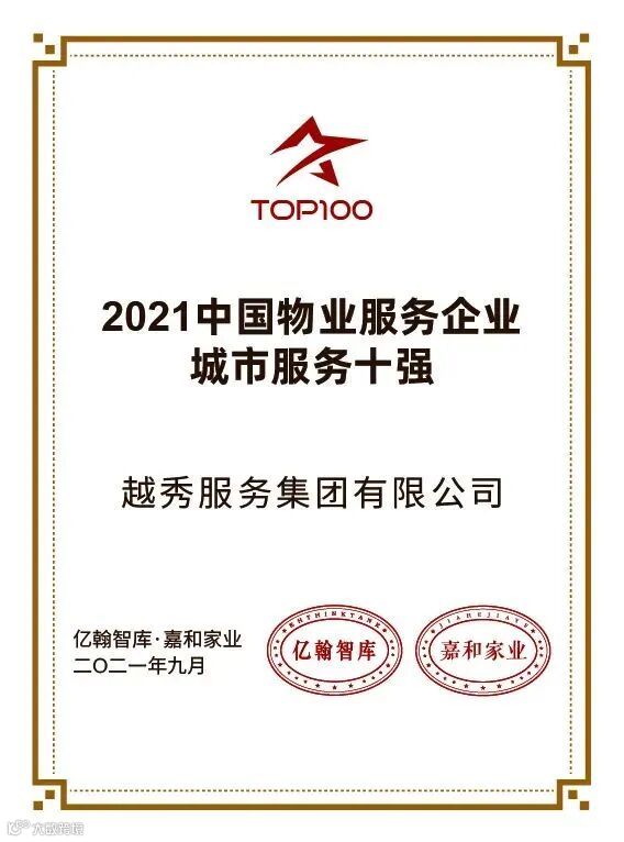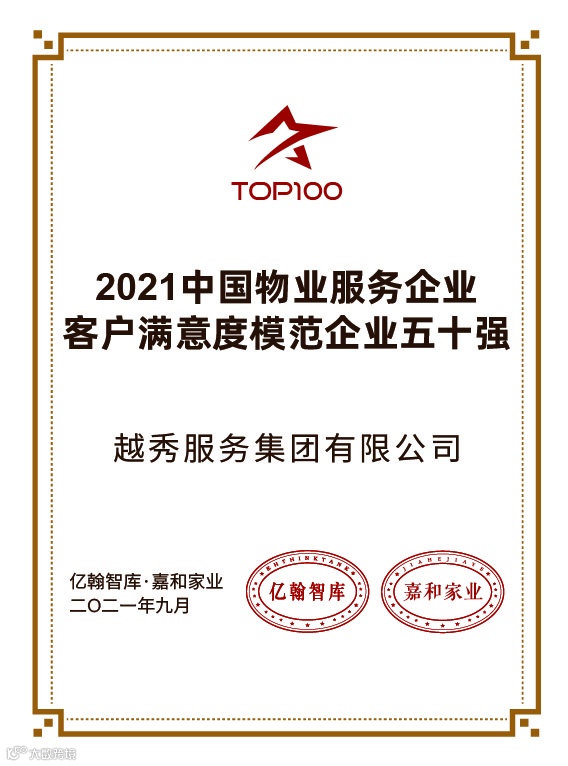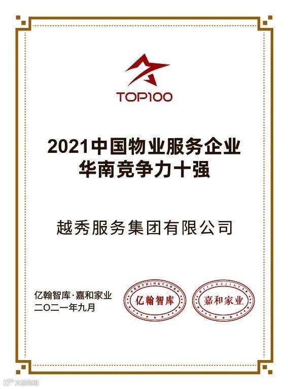 越秀服务凭借雄厚的综合实力,荣膺2021中国物业服务企业城市服务十强、2021中国物业服务企业华南竞争力十强、2021年中国物业服务企业客户满意度模范企业50强,凭借着多年来对高质量品牌服务、高增长市拓道路的坚持,进入中国物业服务行业综合实力前列。