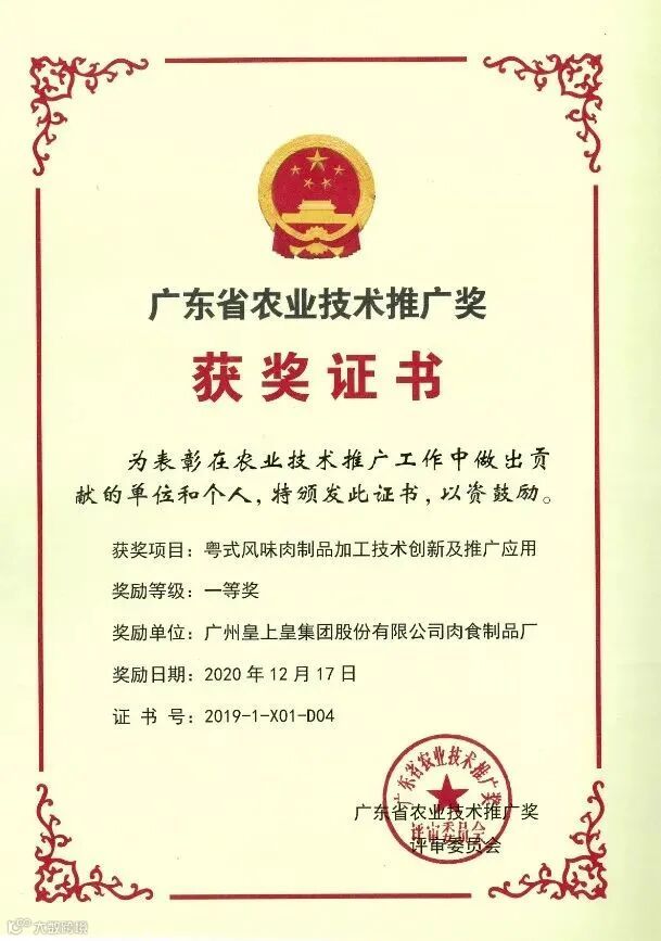 2021年5月,越秀皇上皇股份属下肉食制品厂“粤式风味肉制品加工技术创新及推广应用”项目荣获广东省农业技术推广奖一等奖。