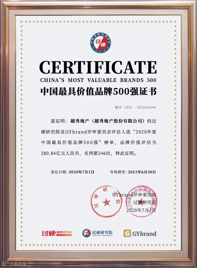 越秀地产坚守“成就美好生活”品牌使命,致力于打造高质量品牌,彰显企业的经济、社会以及文化价值,实现自身持续经营并身体力行带动行业健康运行,品牌价值达280.84亿元,跻身中国最具价值品牌500强,并获中国地产时代百强榜“2020年度品牌价值传播奖”及“2020年度粤港澳大湾区金牌竞争力奖”。