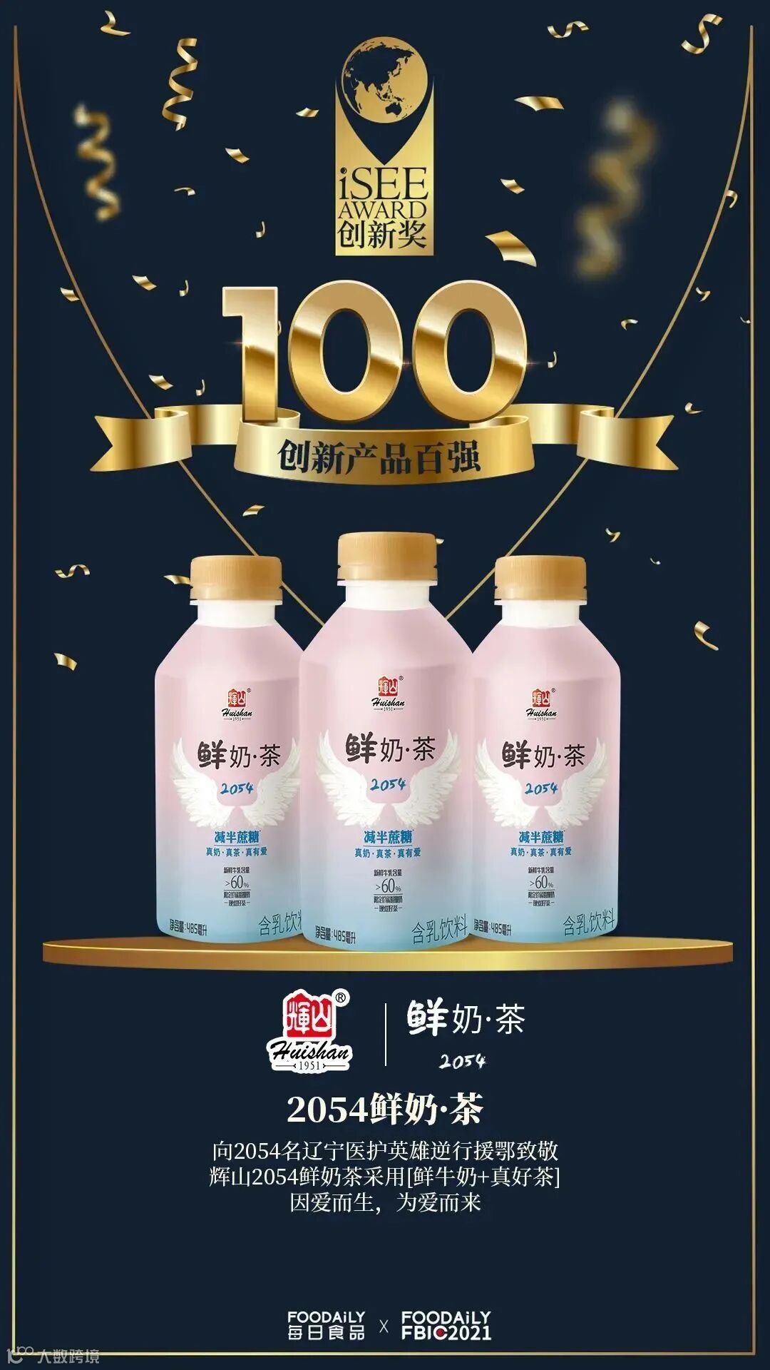 2021年4月13日,越秀辉山2054鲜奶·茶在196家传统及新锐品牌的400+创新产品激烈的竞争中成功突围,荣登iSEE创新奖“创新力百强榜单”,成为「新食品时代」的代表性产品。