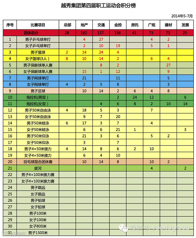 越秀地产板块能否在职工运动会积分总榜上继续独占鳌头?而仅相差一分的越秀交通与越秀金控究竟谁能在最后关头抢占优势?集团各板块还有哪些赛场亮点?敬请大家期待接下来微信的专题精彩报道~