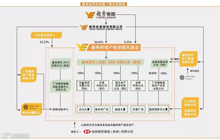经过一系列调整,现在,越秀房产基金持有旗下物业的结构如右图。