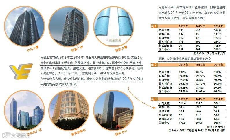 尽管近年来广州市商业地产竞争激烈,但纵观越秀房产基金2012年至2014年年报,旗下的6处物业租金均呈现上涨,具体数据如如表1。