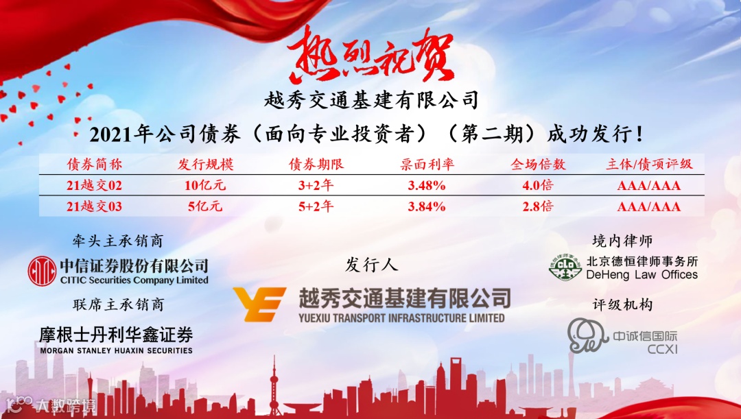 2021年5月11日,越秀交通于上交所成功发行2021年第二期公司债券,其中“21越交02”(3+2期限)发行规模10亿,利率3.48%,全场认购倍数4.0倍;“21越交03”(5+2期限)发行规模5亿,利率3.84%,全场认购倍数2.8倍。