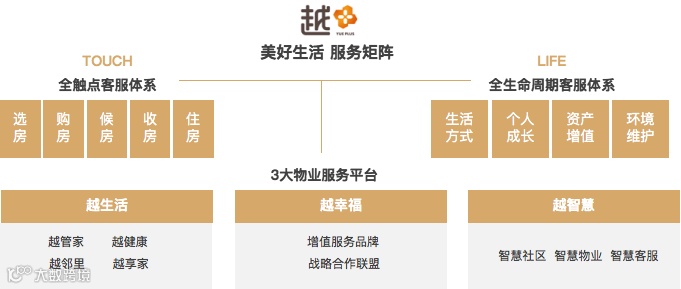 越秀服务以客户诉求为导向,成功打造多维度服务矩阵:“TOUCH全触点”服务体系以早介服务、案场服务和社区服务等为依托,在客户选房、购房、候房、收房到住房的全过程中提供悦心服务,致力打造美好生活的居住场景;“LIFE全生命周期”服务体系则秉承为“业主房产保值、增值”的服务理念,聚焦业主关注的“生活方式(Living)、个人成长(I)、资产增值(Finance)、环境维护(Environment)”四大维度,在确保小区环境赏心悦目的基础上,挖掘居住的深层次价值,为业主提供高品质、有特色的“越”式服务。