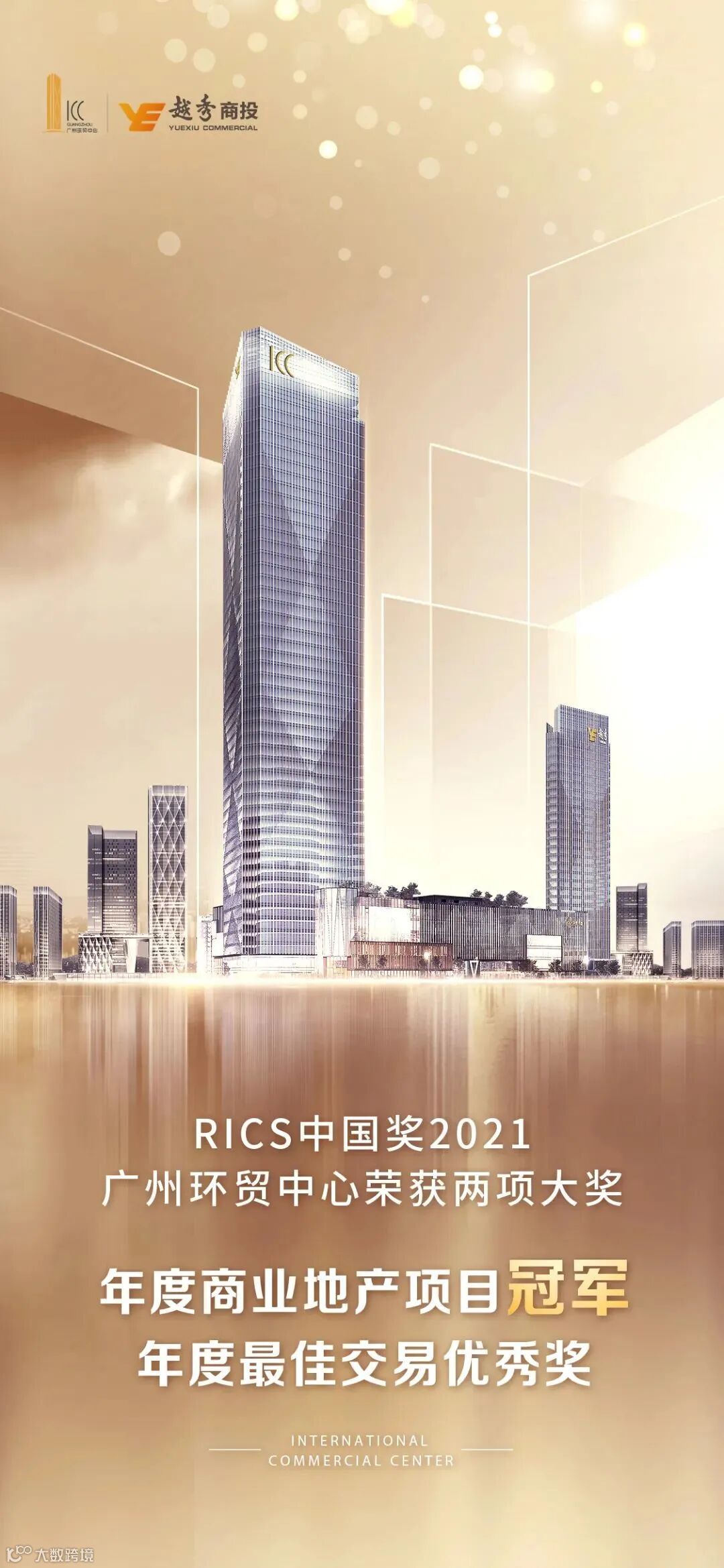 继去年广州国际金融中心、武汉越秀财富中心获得“年度设施管理团队优秀奖”、“年度可持续发展成就优秀奖”,及入围了“年度商业地产项目”奖项,今日,广州环贸中心(简称“广州ICC”)斩获“年度商业项目冠军”、“年度最佳交易优秀奖”两项大奖,表明业界对越秀商投项目的专业性和社会价值的赞誉,也是国际权威机构对越秀写字楼3.0引领商办变革的认可。