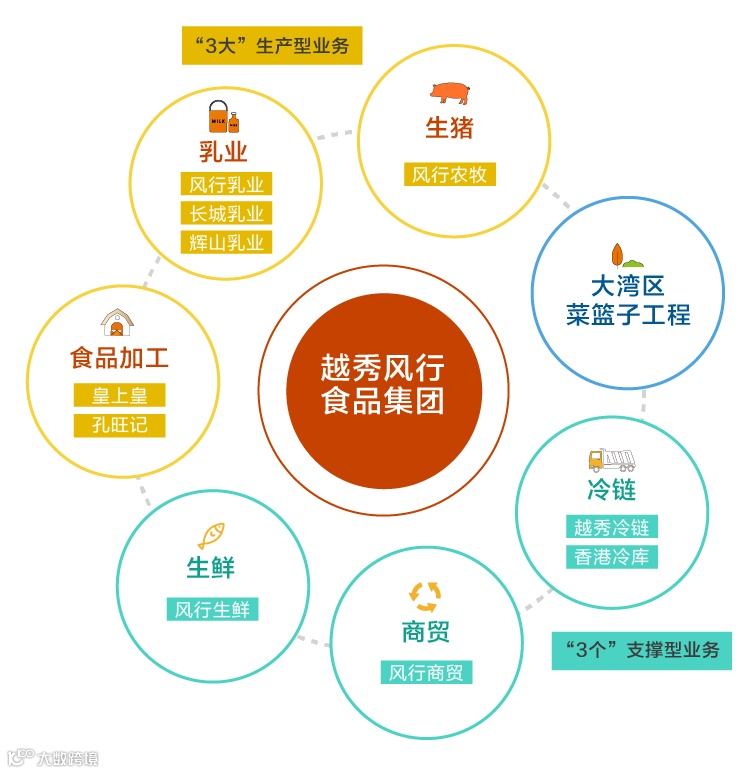 越秀风行食品,以乳业、生猪、食品加工、生鲜、商贸、冷链产业(“3+3”)构建产业布局,打造全产业链的食品产业集团,力争成为粤港澳大湾区食品行业的领先者,中国农业与食品行业第一梯队企业。