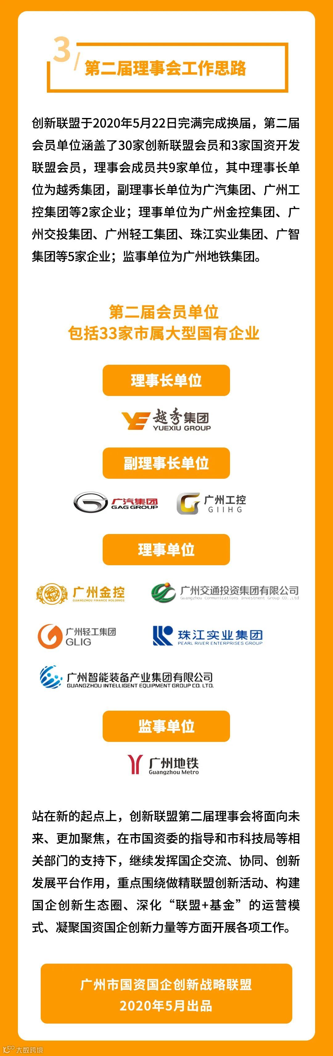 大会审议并全票通过了创新联盟第一届理事会工作报告、财务工作报告、章程修订草案和大会选举办法等七项议案,选举产生了创新联盟第二届理事会、监事会成员单位。越秀集团当选第二届理事长单位,广汽集团、广州工控集团当选第二届副理事长单位,广州金控集团、广州交投集团、广州轻工集团、珠江实业集团、广智集团当选第二届理事单位,广州地铁集团当选第二届监事单位。越秀产业基金总裁卢荣连任秘书长。此外,会上还为创新联盟第二届理事会单位授牌,并为九位兼职执行秘书长颁发聘书。