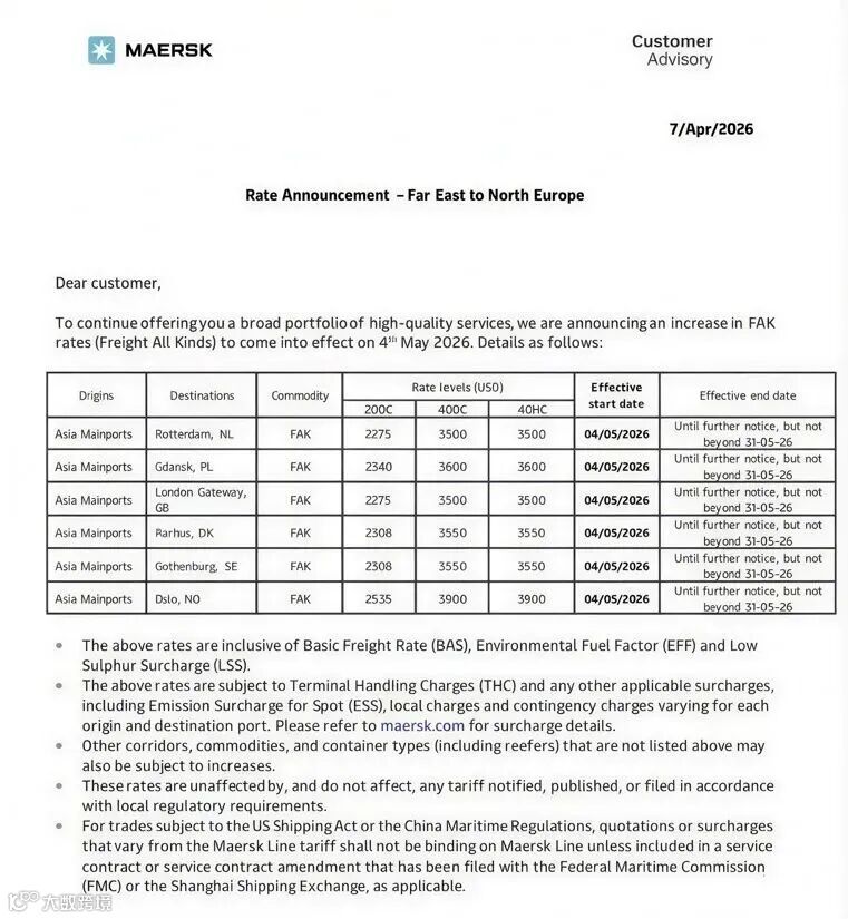 4月7日,马士基发布运价公告,宣布自5月4日起上调远东至北欧航线全货种(FAK)费率,涵盖基本运费、紧急燃油附加费及低硫附加费。此次调价反映燃油成本攀升及区域航运环境复杂化背景下,航运企业通过综合调价机制应对运营压力。