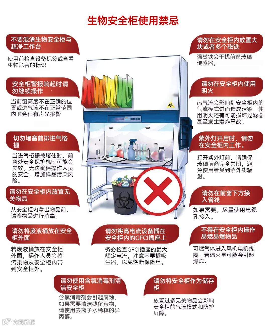 请勿在安全柜内放置无关物品,从安全柜内拿出物品前,请将物品进行消毒。