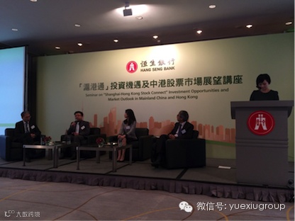 6月3、4日,广证恒生策略研究部副首席分析师张广文先生代表出席参加恒生银行一连三场举行的『沪港通』投资机遇及中港股票市场展望讲座,与恒生银行跨境及人民币业务发展部主管颜先生、恒生投资顾问服务主管梁女士以及恒生指数董事兼总经理关先生一同担任主讲嘉宾,对『沪港通』带来的投资机遇和两岸股票市场影响进行观点分享。借助『沪港通』的东风和恒生银行的资源平台,广证恒生得以在港接连亮相并大力推广,研究品牌颇受认可,为公司下一轮的发展奠定了基础。