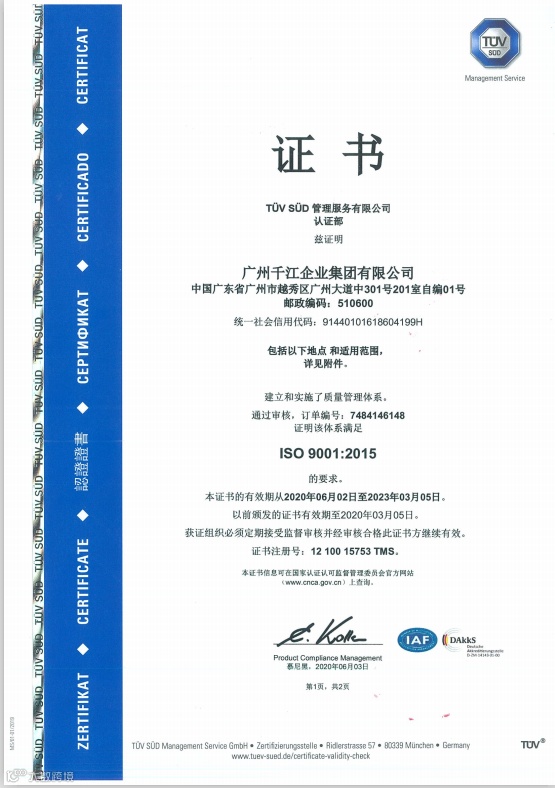 5月,TUV认证检测公司审核组专家前来广州千江、深圳千江进行ISO9001质量管理体系的现场审核。审核专家根据质量管理体系审核要求,对公司经营目标、客户满意度、员工满意度三个维度进行了全面的现场检查和资料审核,最终一致认为公司的质量管理体系符合认证标准。