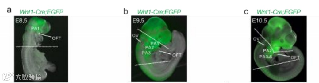 图4 小鼠胚胎嵴细胞a-cWnt1-Cre ;R-OSA-EGFP遗传谱系追踪显示,(c)在E8.5 (a)、E9.5 (b)和E10.5 (c)胚胎的咽部区域