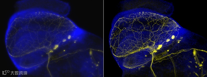 图9 果蝇神经元,蓝色:DAPI,黄色:GFP
