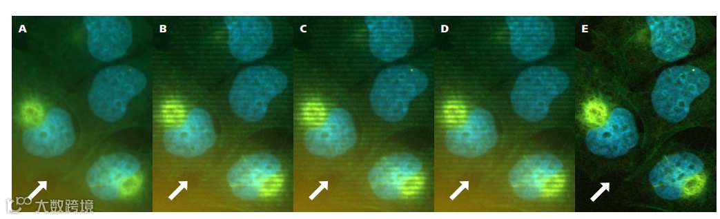 A:宽场图像。B-D:带栅格的原始图像。E:样品的光学切片。结构化照明(如箭头所示)有效消除了非焦平面光