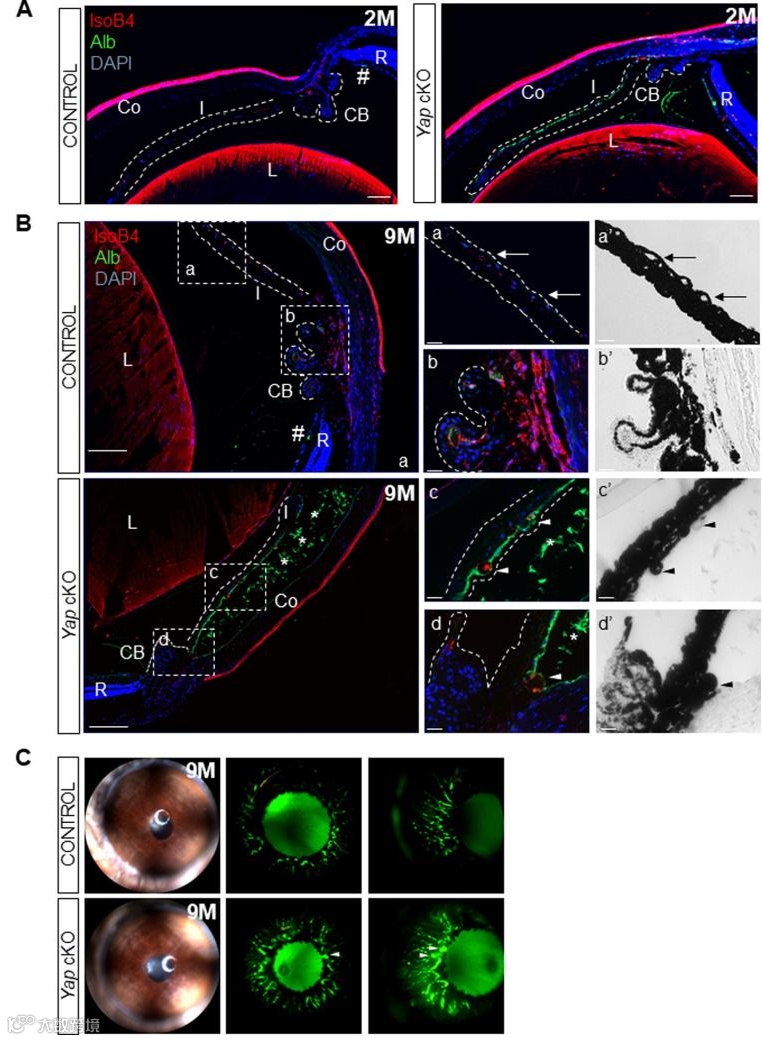 图5 Yap cKO的眼睛表现出血水屏障破坏
