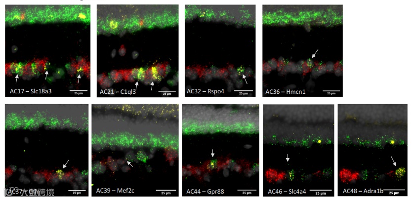 图6 神经节细胞层AC亚型标记移位的原位杂交图像