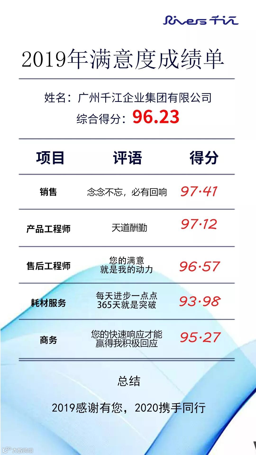 广州千江企业集团广州千江为期2个月的顾客满意度调查成绩单终于出来了,2019年,我们共回收了219份问卷,每一份问卷的回复不仅代表每一位客户的心声,也代表了您对我司的信任和鼓励。在此特别感谢各位亲爱的客户在百忙之中的参与和支持!现将满意度综合评分及各关键职能评分公布如下: