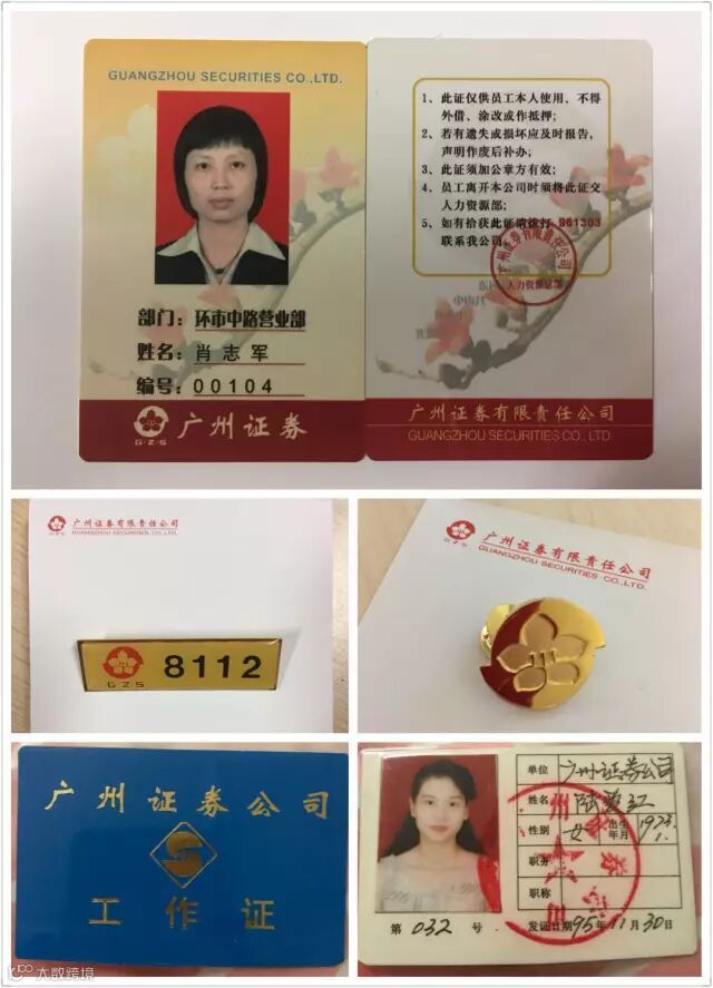 广州证券成立近30年,照片为广州证券工作证件的变化。