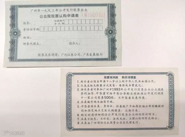 广州证券1993年新股申购单。当年的新股认购还没有十分严格的规则,而且还没有分业经营,所以表上注明的承销商会有券商和银行。