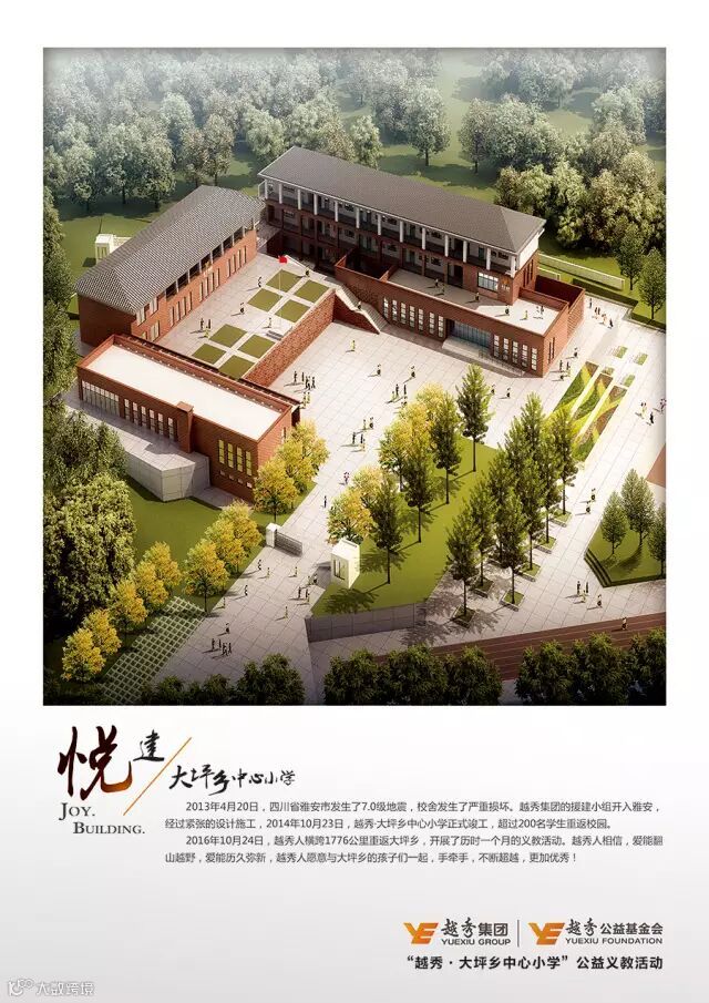 2013年4月20日,四川省雅安市发生了7.0级地震,校舍发生了严重损坏。越秀集团的援建小组开入雅安,经过紧张的设计施工,2014年10月23日,越秀•大坪乡中心小学正式竣工,超过200名学生重返校园。