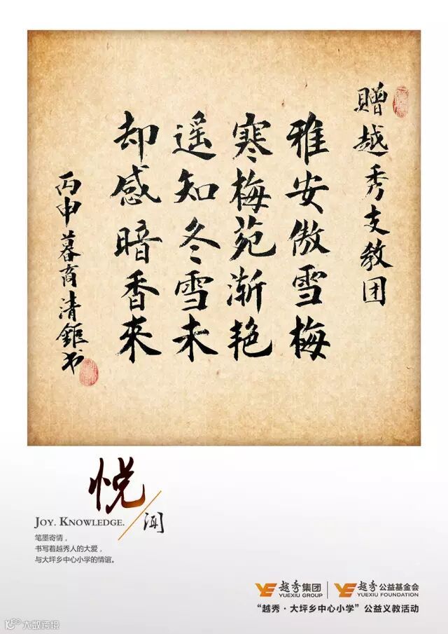 笔墨寄情,赠字画以表心意。首批志愿者返粤时收到了一份来自大坪乡的礼物—— “赠越秀支教团:雅安傲雪梅,寒梅苑渐艳。遥知冬雪未,却感暗香来。”简单四句诗词,却娓娓道出越秀人的大爱与大坪乡中心小学的情谊。