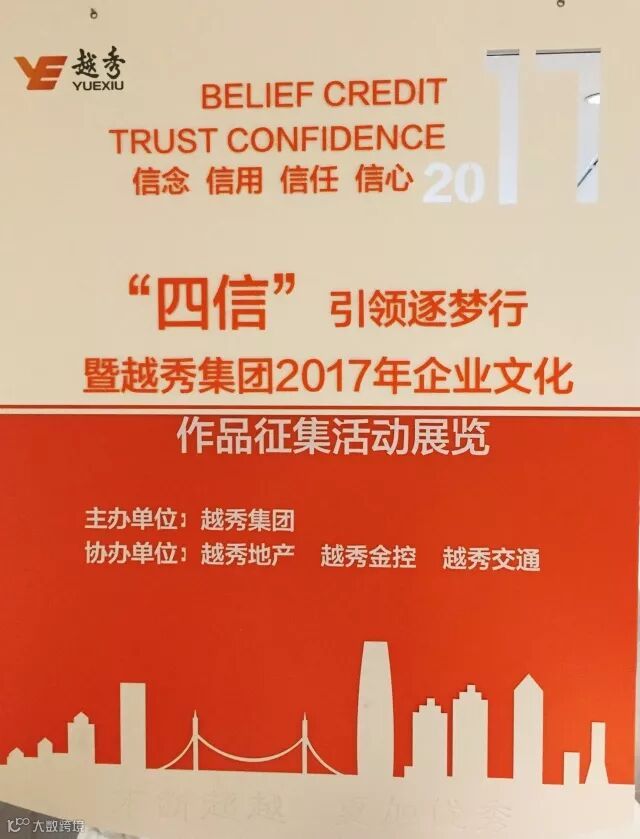 集团党委工作部牵头举办了此次展览,由越秀地产、越秀金控、越秀交通协办完成,选取了部分海报、摄影及书法优秀作品供大家欣赏,希望通过此次展览能让大家体会到集团企业文化、廉洁文化的内涵。透过作品背后的故事、蕴含的寓意感悟核心价值观内涵“四信”,以更饱满的工作热情推动集团“十三五”战略实施和2017年事业计划完成。