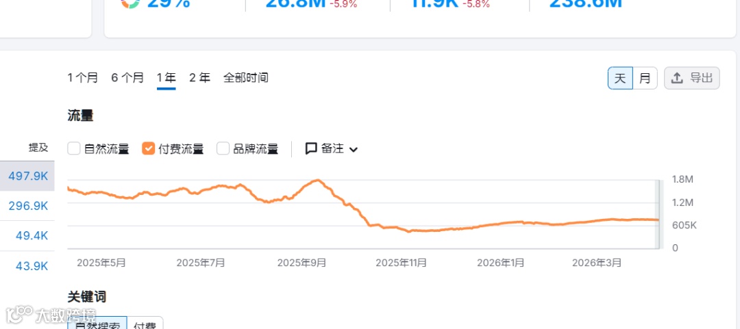 外投广告规模收缩:Google广告流量由1.8M峰值降至600K,降幅达66.7%。