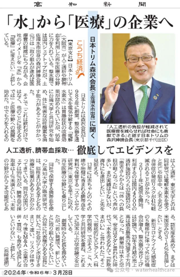 日本多宁(大阪市)正在人工透析和利用脐带血的再生医疗领域中发力。在整水器方面已是日本国内市场占有率头部企业,但土佐清水市出身的森泽绅胜会长(79岁)表示:“如果我们的工作取得成效,那也将有助减轻医疗费负担。我们希望把公司从单纯的‘水’产品企业向‘医疗’方向转型。”