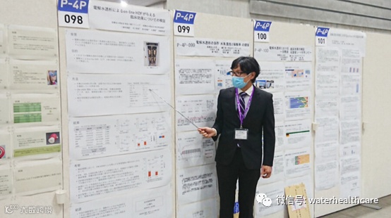 这是海报发表时的情景。埼友八潮诊所(埼玉县八潮市)的滨本达雄医生在介绍该院所做的电解水透析的临床结果。能在这么多的治疗机构中被研究和验证,很令人振奋。
