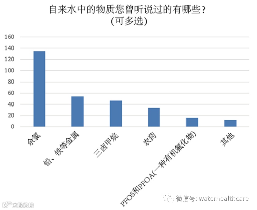 此外,在“自来水中的物质您曾听说过的有哪些?”这个问题的答案中,“余氯”排在首位。