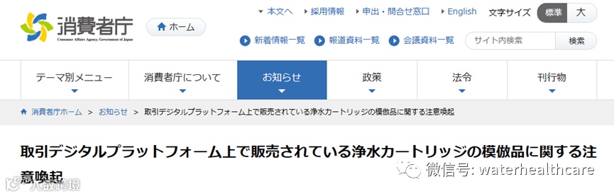 2月1号,日本消费者厅发布了消费警示,提请消费者谨防数字购物平台上存在的销售家用净水器用假冒滤芯的行为,内容如下: