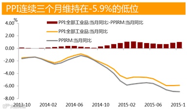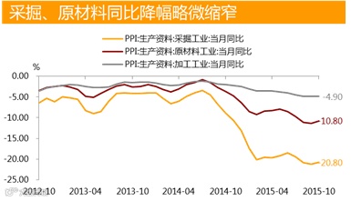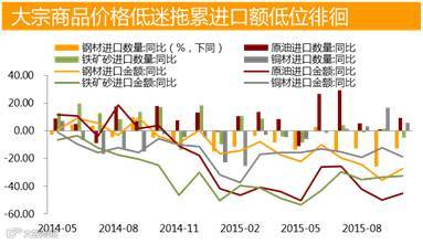 工业生产者购进价格同比跌幅继续扩大,输入性通缩压力仍将延续。未来PPIRM同比降幅可能有所收窄,但内外因素难以支持工业品价格回升,负增长态势仍将延续。近期大宗商品价格走出新一轮探底行情,国际原油价格持续低迷,不排除油价跌破前期低点的可能,输入性通缩导致工业生产者购进价格降幅继续扩大,并对PPI走势构成下行压力。受此影响最为明显的是石油和天然气开采、金属矿产开采和冶炼、煤炭及炼焦等相关行业。低通胀环境下