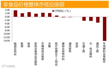 价格上涨,环比涨幅分别为0.6%、0.3%。从同比来看,非食品价格同比涨幅收窄0.1个百分点至0.9%,依然低于食品价格及CPI整体涨幅。除了8月以外,近一年以来CPI同比涨幅都低于2%,非食品价格一直处于低位是拉低CPI的重要原因。去年9月份以来非食品价格在0.9%-1.3%之间低位波动,与资源能源相关的燃油价格、水电煤等燃料价格持续负增长。由于非食品价格影响CPI中长期走势,需要警惕非食品价格的低迷对通胀预期的影响。