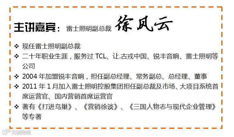 本次财富大讲坛的主题为“营销中怎样傍大款?——大客户营销策略与技巧”,邀请了雷士照明副总裁徐风云,总结其二十年营销生涯的心得经验,从大客户营销的角度为您剖析如何突破大客户营销之门的策略、方法和技术。