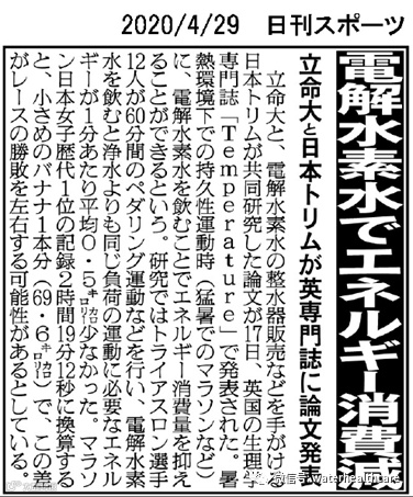 立命馆大学和从事电解水素水整水器等产品研发生产和销售的日本多宁公司的合作研究论文,于4月17日发表在英国生理学专业期刊《Temperature》。该论文指,在暑热环境下的持久性运动时(酷暑天的马拉松运动等),通过饮用电解水素水能抑制体能的消耗。研究中,12名铁人三项运动员进行了60分钟蹬脚踏车运动,喝电解水素水与喝净水相比较,同等负荷运动量所需的能量消耗,平均每分钟减少了0.5大卡。如果根据日本女子马拉松历届最佳记录2小时19份12秒进行换算的话,这相当于一根小香蕉的热量(69.6大卡),但这个微小差异可能决定了比赛的胜败。