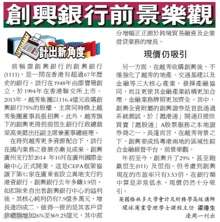 在得到越秀更多资源配合下,该行在国内业务之发展亦渐见成果。创兴广州支行于2014 年10月在广州国际金融中心正式开业,这是CEPA框架协议下第七家在广东省设立异地支行的港资银行。创兴银行去年多赚3.9倍,如扣除来自出售创兴银行中心的溢利后,其核心纯利仍有7.9亿多万元,增长达四成二。值得一提的是其客户贷款总额增加26%至569.25亿元,其中部分增幅正正源于跨境贸易融资及企业借贷业务的增长。