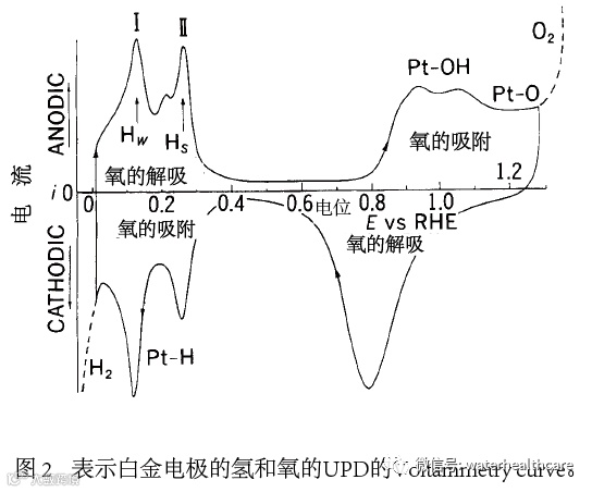 尽管氢与电极表面白金原子是按1:1的比例化学吸附,但其吸附力应该是根据对手的白金原子构成什么样的晶格而有所不同。常规白金电极的表面是由细小的多晶构成,可以大致分类为四个相邻的原子排列部分和六个相邻的原子排列部分。Hs被认为是吸附在前者上面的氢,Hw被看作是吸附在后者上面的氢。