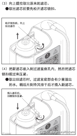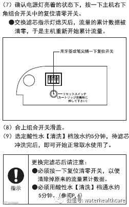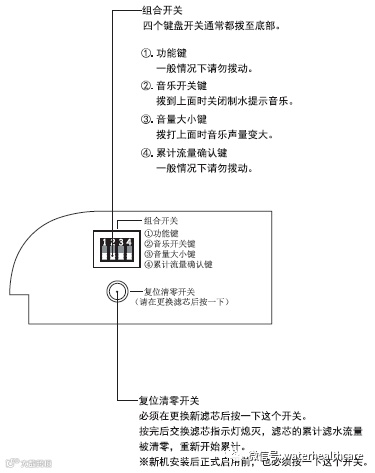 方法是滑开主机右下角的盖板,可看到标有1、2、3、4的小键盘开关,把第4个键盘拨上去后,查看操作面板上一共亮了几盏灯(7个制水档按钮指示灯和1个电源按钮指示灯一共8盏),每盏灯表示1.5吨用水,8盏灯全亮的话就表示这支精滤芯12吨的过滤使命结束了,此时就需要购买更换新滤芯了。这个功能平时几乎无需用到,因为滤芯的过滤流量和使用时间都是自动累计的,只要不长时间拔下电源插头或切断总闸,它就在自动工作,一旦时间满了12个月或流量到了12吨后,主机操作面板左上角的“交换滤芯指示灯”就会自动亮红灯提示,同时也会发出短暂报警时进行提示。此时只要按一下复位开关即可停止报警提示,流量和时间数据清零并重新开始累计。在更换滤芯并冲洗滤芯5分钟后,需要按复位开关一次以便让水机正常累计数据。