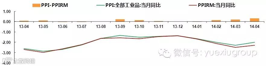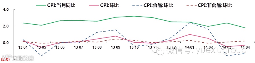 4月CPI同比上涨1.8%,涨幅较上月缩小0.6个百分点;PPI同比下跌2.0%,跌幅较上月缩小0.3个百分点。受鲜菜和猪肉价格大幅下降影响,食品价格继续回落,导致CPI涨幅略有缩小;投资增速放缓、产能过剩、治理污染导致上游行业价格跌幅较大,是造成PPI继续走弱的主要原因
