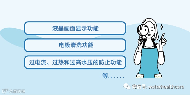 另外,为了保护整水器安全,也有必要事先了解清楚目标产品是否具有防止过流、过热和过高水压的功能,以及发生异常时的自动感知功能等。
