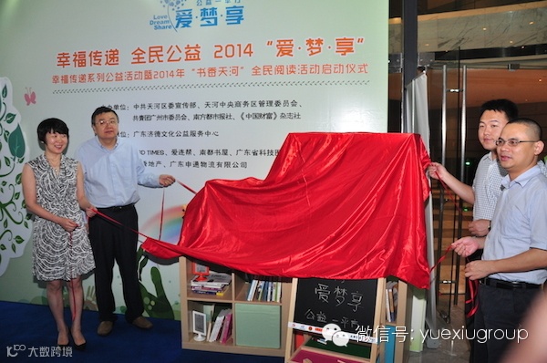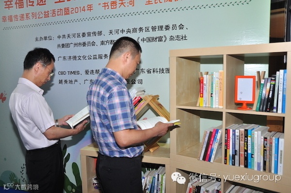 昨天(4月23日)是世界读书日,2014“爱·梦·享”幸福传递系列公益活动暨2014年“书香天河”全民阅读活动,在广州天河CBD腹地的广州国际金融中心(西塔)的四季酒店顺利启动,这次活动由中共天河区委宣传部、天河中央商务管理委员会、共青团广州市委员会、南方都市报社、《中国财富》杂志社主办,而作为西塔的业主单位,越秀地产自内而外参与,除了划出寸土尺金的西塔宝地做公益站点,亦从企业内部选派志愿者定期对站点图书进行整理,将公益作为企业文化的重要元素。在当天现场创新启用“公益一平方”爱梦享幸福传递自助交流公共空间,倡导有爱、有梦想、益分享的诚信社交理念。