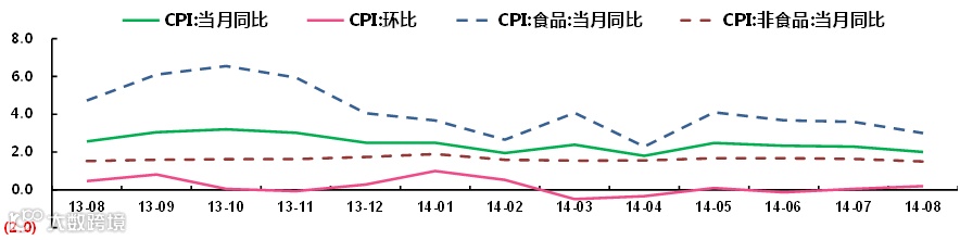 8月CPI同比上涨2.0%,涨幅较上月收窄0.3个百分点;PPI同比下跌1.2%,跌幅较上月扩大0.3个百分点。其中,PPI未能延续连续四个月跌幅收窄,一方面受国际大宗商品价格走弱影响,另一方面也显示我国国内总需求仍然疲软,经济增长动能再次减弱。