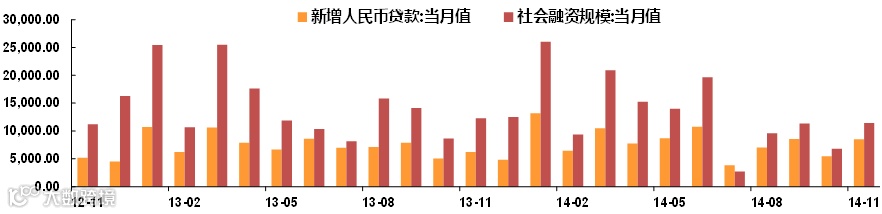 11月M2同比增速放缓至12.3%,增速较上月末下降0.3个百分点。当月社会融资规模1.15万亿元,比去年同期减少847亿元;其中,人民币贷款增加8527亿元,同比多增2281亿元。新增人民币贷款规模较上月大幅上升,主要原因是央行调整了合意贷款规模,其目的在于通过增加贷款额度维持货币宽松