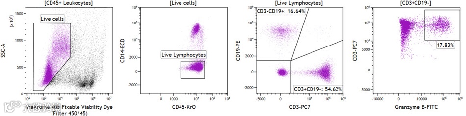 复苏后的PBMC在免疫染色之前不添加(图 3)或者添加ViaKrome 405可固定活性染料(55℃,10分钟)(图 4)。然后,使用Perfix-nc细胞染色试剂盒(型号 B10825)处理细胞,并用Granzyme B-FITC、CD19-PE、CD14-ECD、CD79a-PC5.5、CD3-PC7 和 CD45- Krome Orange 进行染色。